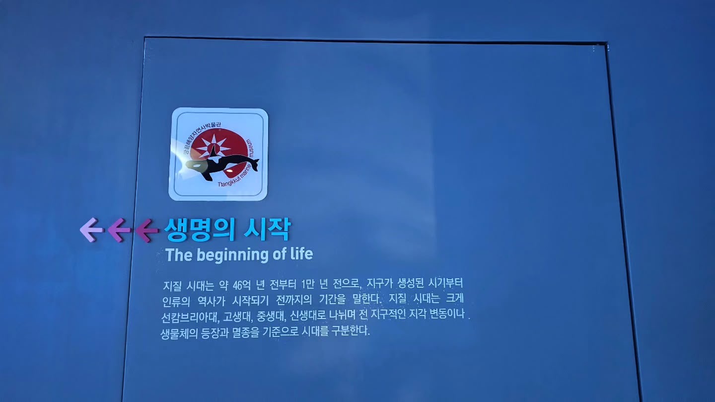 박물관의 첫 전시 코너인 **“생명의 시작 (The Beginning of Life)”**는 지구 생성부터 인류 역사 이전까지의 **지질 시대(약 46억 년 전~1만 년 전)**를 다룹니다. 지질 시대는 크게 선캄브리아대, 고생대, 중생대, 신생대로 구분되며, 판 구조 운동과 생물의 등·퇴장·멸종을 중심으로 시대가 나뉩니다.