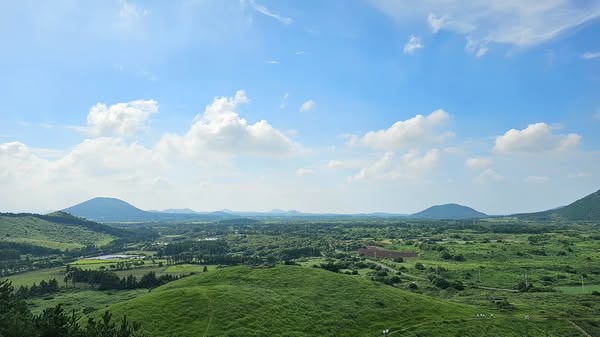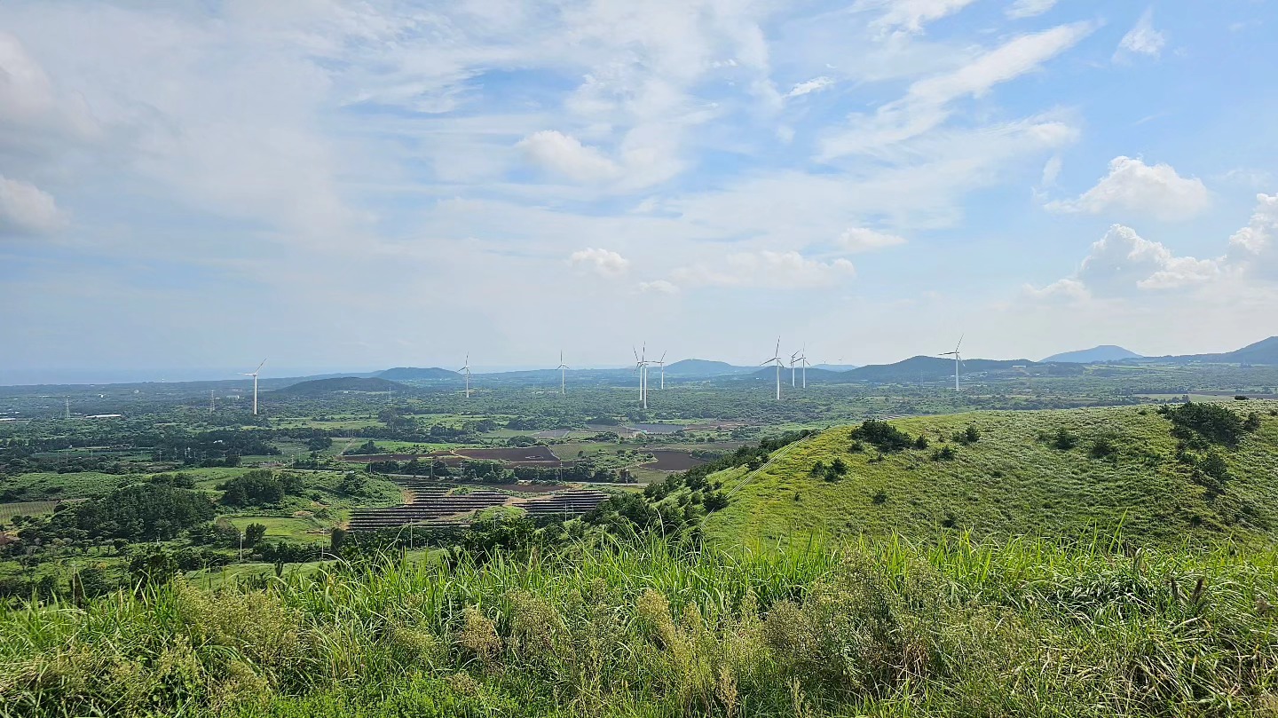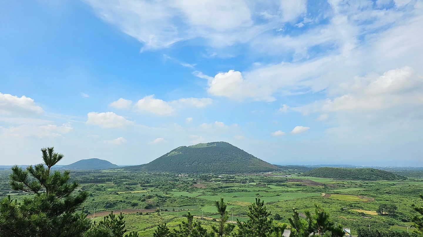 정상에 올라서면 ‘와!’ 하고 감탄사가 절로 나와요. 커다란 분화구가 마치 용의 눈처럼 움푹 파여 있고, 그 안은 초록빛 초원으로 가득해요. 멀리 제주 바다와 마을까지 한눈에 들어와서 사진 찍기에도 완벽한 장소랍니다. 특히 해 질 녘에는 황금빛 햇살이 분화구를 물들이며 환상적인 분위기를 만들어 줘요🌅.