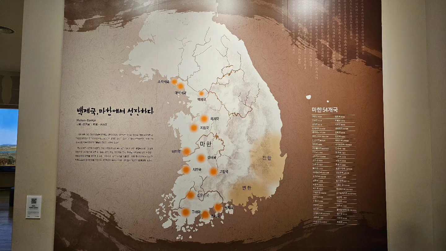 두 번째 전시실은 백제의 왕도 한성에 관한 내용을 다루고 있습니다. 왕도란 왕이 나라를 다스리기 위해 머물던 도읍을 의미하며, 왕권이 발현되는 중요한 장소였습니다. 한성은 백제의 중심지로서 그 중요성을 지니고 있으며, 백제의 정치, 경제, 문화, 군사적 역량이 집약되어 있는 장소였습니다. 이 전시실에서는 한성을 중심으로 한 백제의 왕도 역할과 그 의미를 자세히 설명하고 있습니다. 백제의 왕도는 시대에 따라 변화를 겪었지만, 그 중심지는 현재의 서울 송파구 일대였다는 점에서 한성은 백제의 역사에서 중요한 위치를 차지하고 있습니다. 또한, 백제는 마한에서 성장한 왕국으로, 마한은 54개의 소국으로 이루어졌으며 오늘날의 경기도, 충청도, 전라도 지역을 포함하고 있었습니다.
