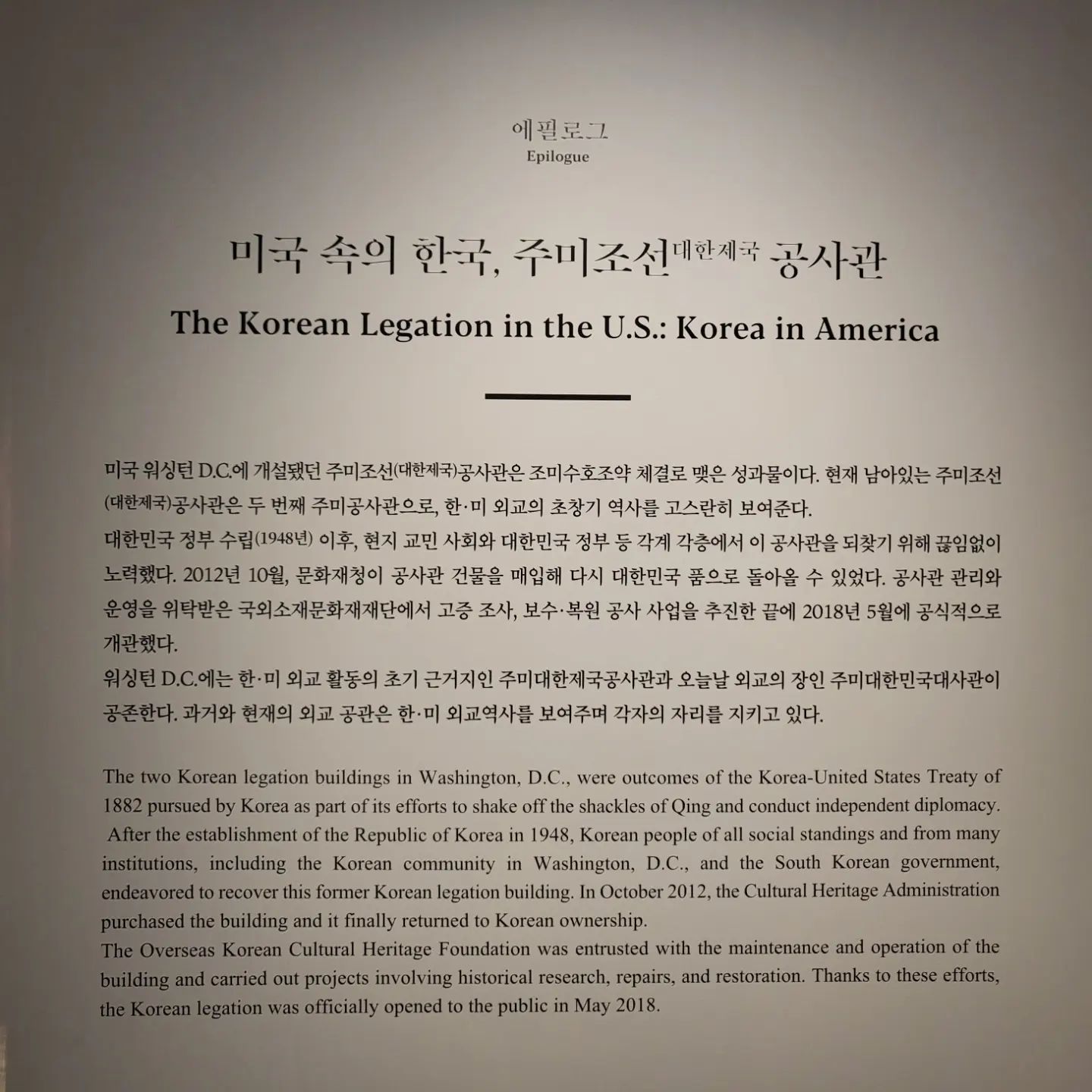 이 전시는 단순히 역사적 사건을 나열하는 데 그치지 않고, 오늘날 한국과 미국이 어떻게 대사관을 설치하고 운영해 온지, 그리고 두 나라가 오랜 시간 공고한 우방으로서 협력해 온 발자취를 돌아보게 합니다. 강화도 조약, 불평등 조약, 그리고 강제적인 한일 병합 조약으로 조선은 일본 제국에 의해 국권을 상실하고 식민지 시대를 맞았습니다. 그 과정에서 수많은 순국선열과 애국지사들의 희생과 헌신을 기억하는 것은 매우 중요합니다.
