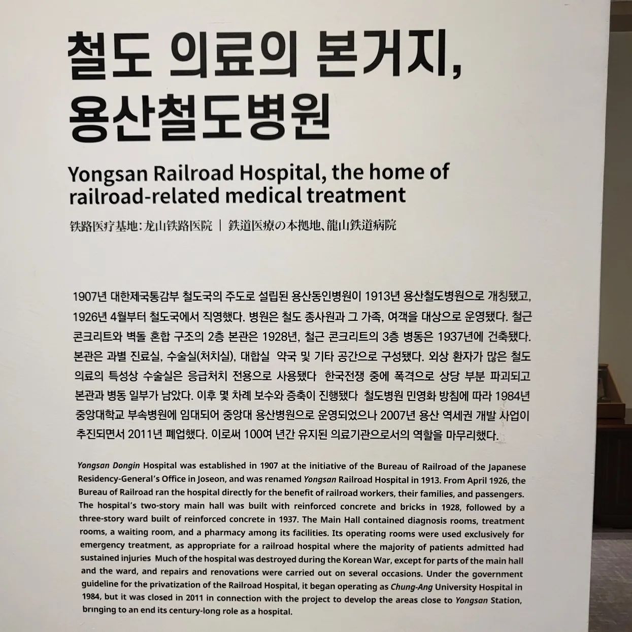 1907년에 설립된 용산동인병원은 철도국 직원들과 그 가족들을 위한 병원으로 시작하여, 1926년에는 용산철도병원으로 개칭되었습니다. 이 병원은 철도 종사자들에게 중요한 의료 서비스를 제공하며, 용산 일대 주민들의 삶의 질을 높이는 데 기여했습니다.