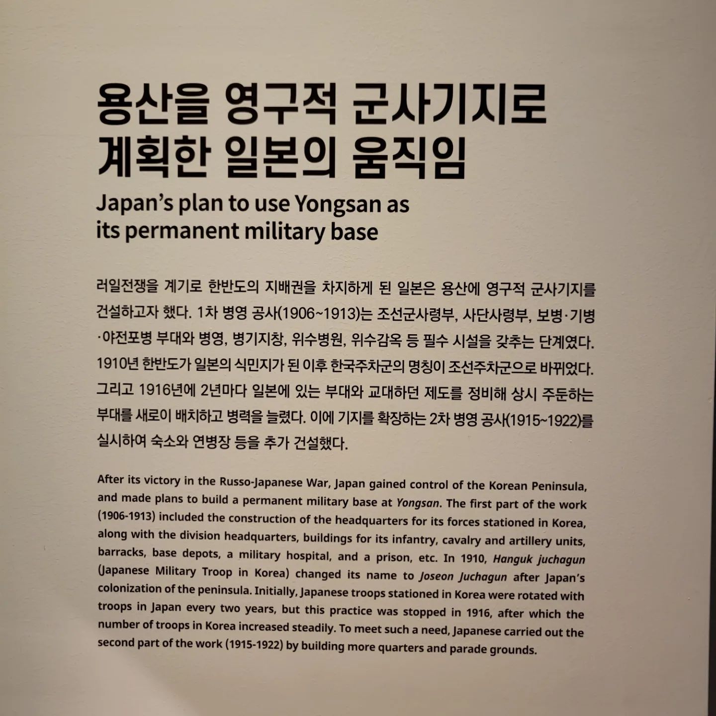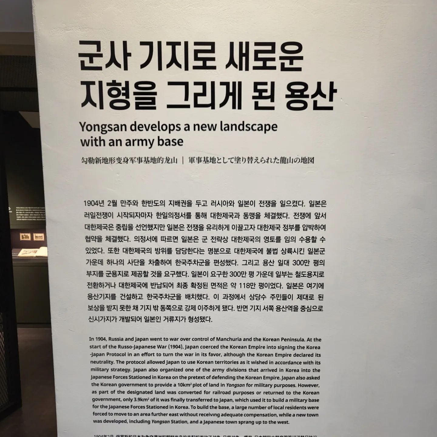 1904년 러일전쟁 당시, 일본은 용산을 군사 기지로 사용하기 위해 한일의정서를 체결하고 대한제국 영토를 수용하였습니다. 이로 인해 용산 일대는 군사 기지로 변모하게 되었고, 그 영향은 20세기 중반까지 이어졌습니다. 특히, 1945년 해방 이후 미군이 주둔하면서 용산은 군사적인 중심지로 중요한 역할을 하게 되었습니다.
