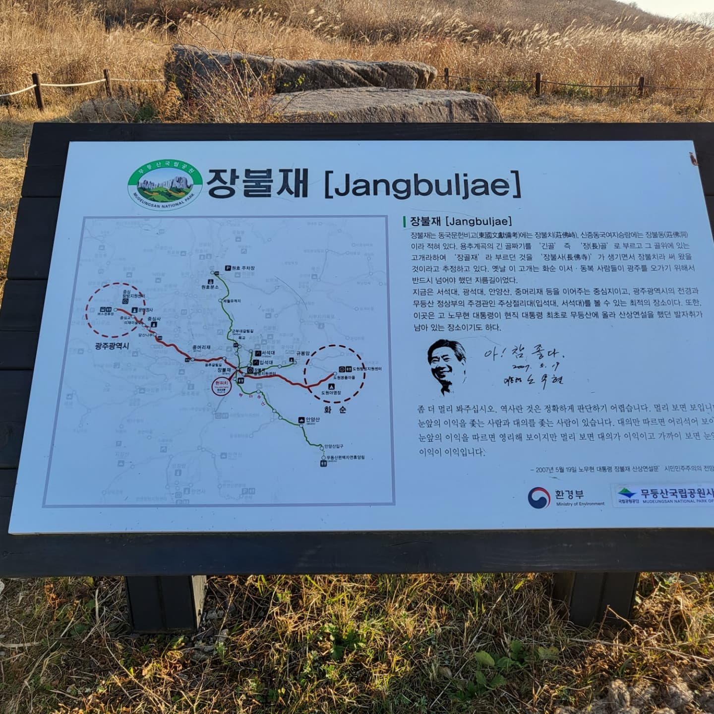 2021년 11월 17일, 순국선열의 날을 맞아 저는 무등산 장불재로 향하는 산행을 떠났습니다. 노무현 대통령님 길 8번 탐방로, 3.5km 구간을 걸으며 그가 걸었던 길과 그의 철학을 되새기고, 한편으로는 우리 민족의 역사와 자주 독립의 가치를 다시 한번 깊이 느끼는 시간을 가졌습니다.