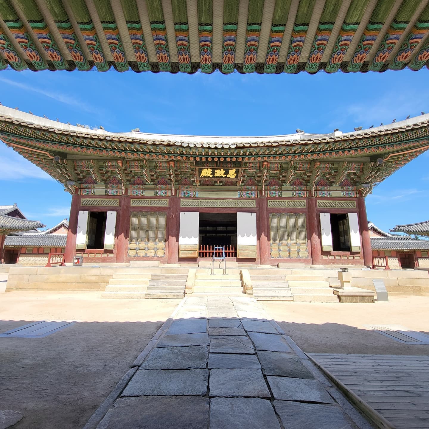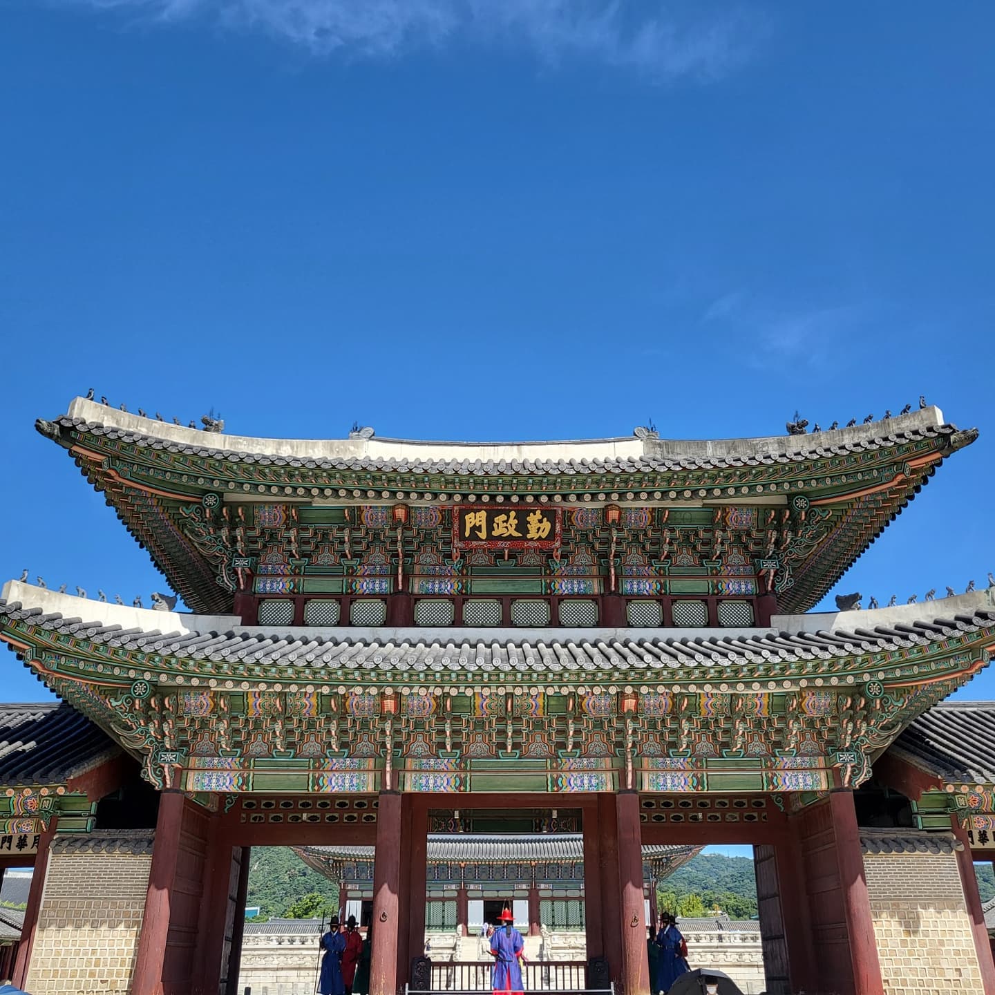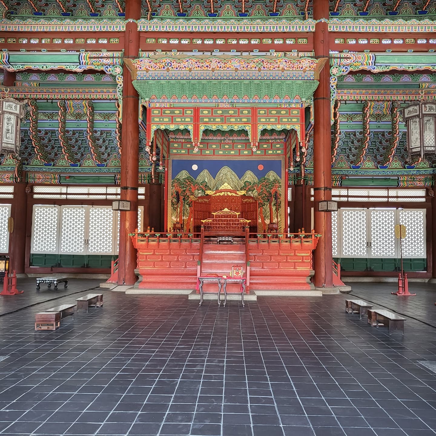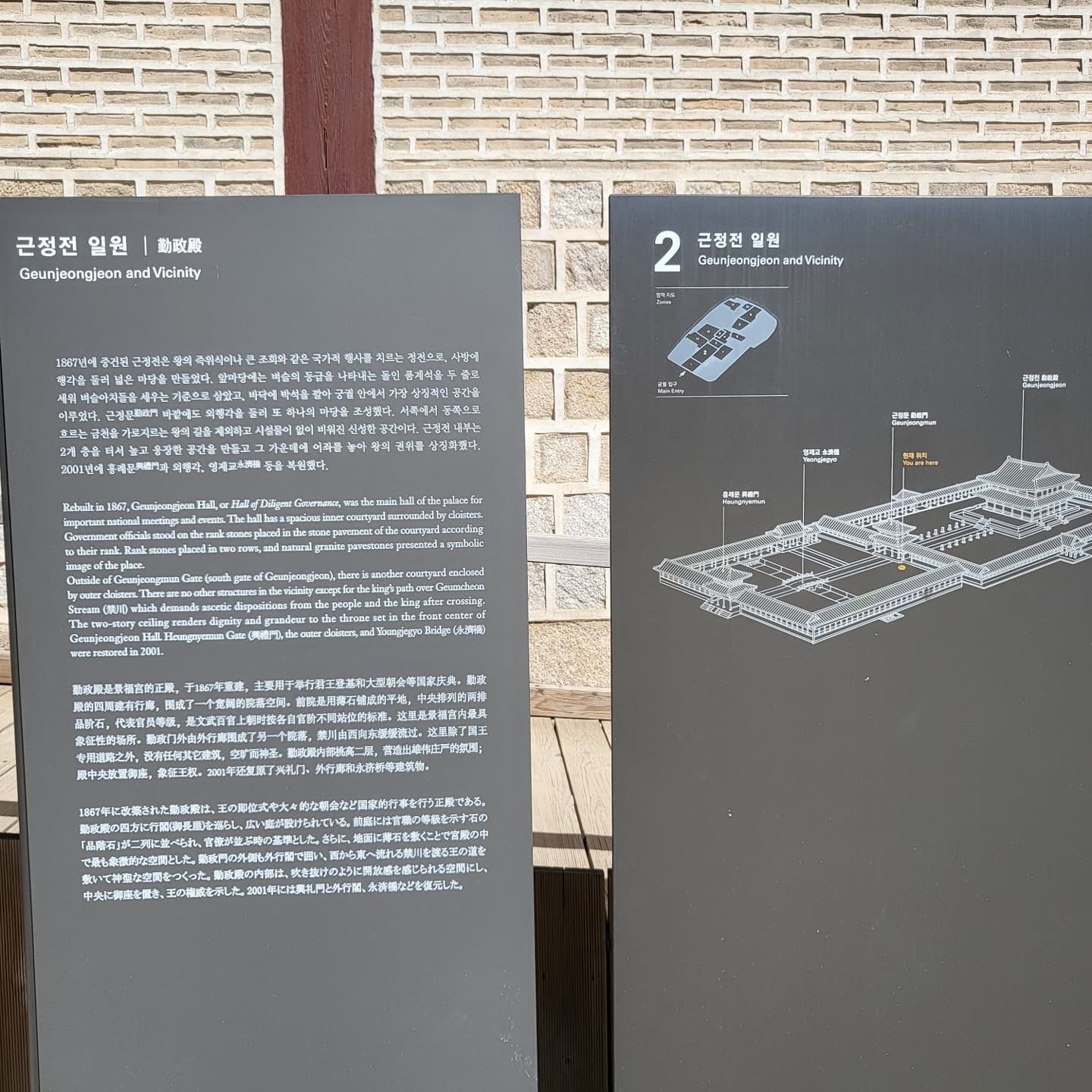 경복궁의 근정전은 궁궐의 중심 건물로, 왕이 정사를 보던 장소입니다. 이곳은 왕권의 상징이며, 중요한 국가 행사와 의례가 이루어졌습니다. 근정전 앞에는 **오포기(五步棋)**라는 특별한 디자인의 마당이 있어, 왕이 신하들과 정사를 논의하는 공간으로 사용되었음을 알 수 있습니다.