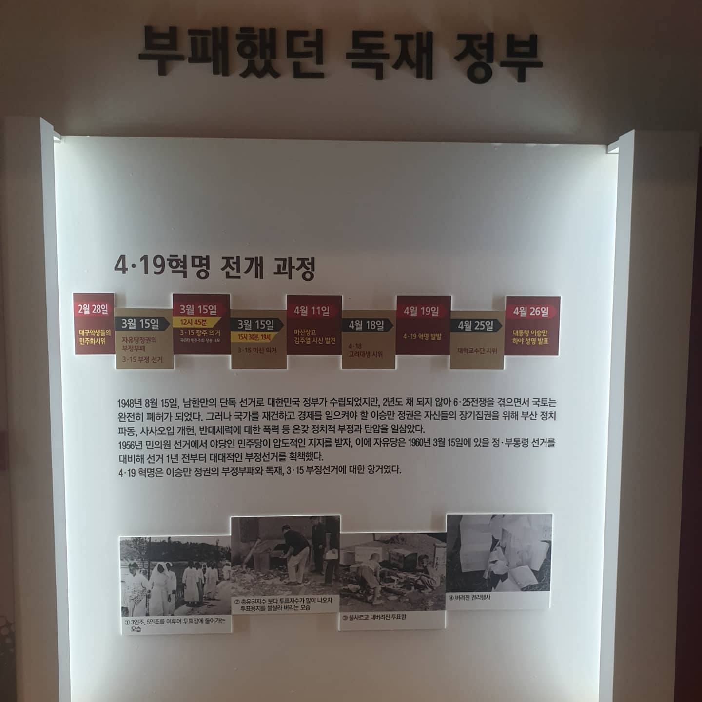 1948년 8월 15일, 남한 단독으로 대한민국 정부가 수립되었지만, 그 후 불과 몇 년 되지 않아 6.25 전쟁이 발발하며 국토는 폐허가 되고 말았습니다. 전쟁의 참화 속에서 나라를 재건하고 경제를 일으켜야 할 시기에, 당시 이승만 정권은 장기 집권을 위한 정치적 부정과 탄압을 일삼았습니다. 1952년 부산 정치 파동과 사사오입 개헌, 그리고 야당과 반대 세력에 대한 폭력과 탄압은 국민들의 분노를 키웠고, 민주주의의 기본 가치인 ‘국민의 뜻’을 무시하는 독재정권의 실체가 점차 드러나기 시작했습니다.