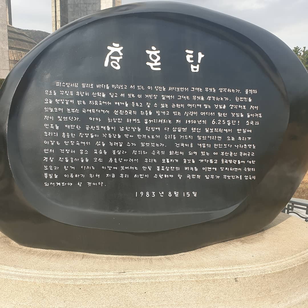 부산광역시 중앙공원 내에 자리한 충혼탑은 나라를 위해 산화한 순국선열과 호국영령의 넋을 기리기 위해 건립된 추모 공간입니다. 1970년에 처음 세워졌으며, 이후 꾸준히 정비되고 확장되며 현재의 모습을 갖추게 되었습니다. 높이 45미터에 달하는 탑은 그 자체로도 위엄과 품격을 느끼게 합니다. 석조 구조물의 단단함과 간결함은 호국정신을 상징하며, 탑 꼭대기로 올라갈수록 좁아지는 형태는 숭고한 정신의 집약과 상승을 상징하는 듯했습니다. 탑 주변에는 태극기가 조용히 펄럭이고 있었고, 제단 앞에는 시민들이 놓고 간 국화꽃과 작은 태극기들이 놓여 있었습니다. 전쟁, 희생, 나라를 지킨 이름 없는 사람들… 이 공간은 그들의 존재를 기억하게 만드는 침묵의 기념비였습니다.