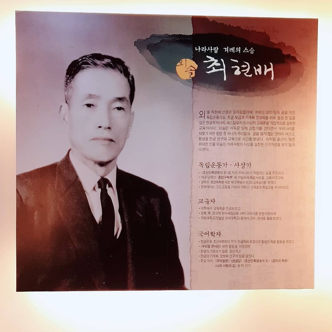최현배 선생(1894~1970)은 울산 출신으로, 일제강점기와 광복 이후까지 평생을 한글 보급과 국어학 발전에 헌신한 인물입니다. 그는 조선어학회(현 한글학회)의 주요 회원이자, 한글 맞춤법 통일안 제정, 큰사전 편찬 등 수많은 업적을 남겼습니다. 또한 “한글이 목숨이다”, “말이 오르면 나라도 오르고 말이 내리면 나라도 내린다”라는 그의 말처럼, 언어가 곧 민족의 혼이라는 신념을 가지고 활동했습니다. 그에게 한글은 단순한 문자가 아니라 우리 민족의 정체성과 주권을 상징하는 수단이었습니다.