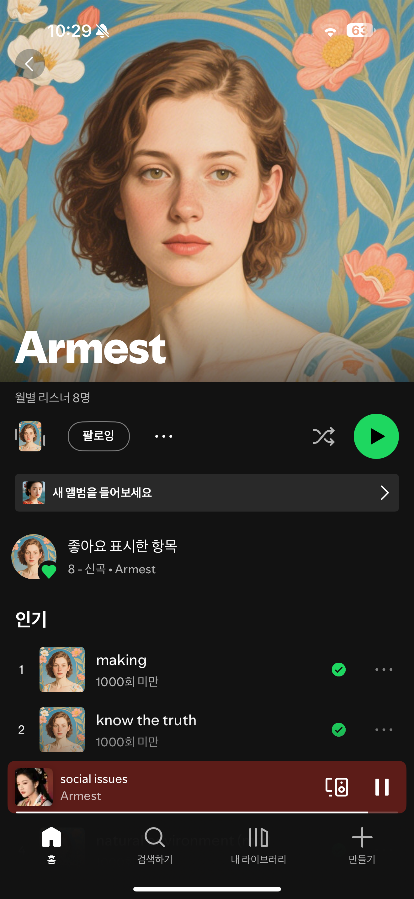 아직 월별 리스너가 8명에 머무르고 있지만, 그 숫자는 곧 수십, 수백, 수천으로 늘어날 겁니다. 여러분의 작은 클릭 하나가 Armest라는 창작자의 커리어를 좌우할 수 있다는 점, 꼭 기억해 주세요.
