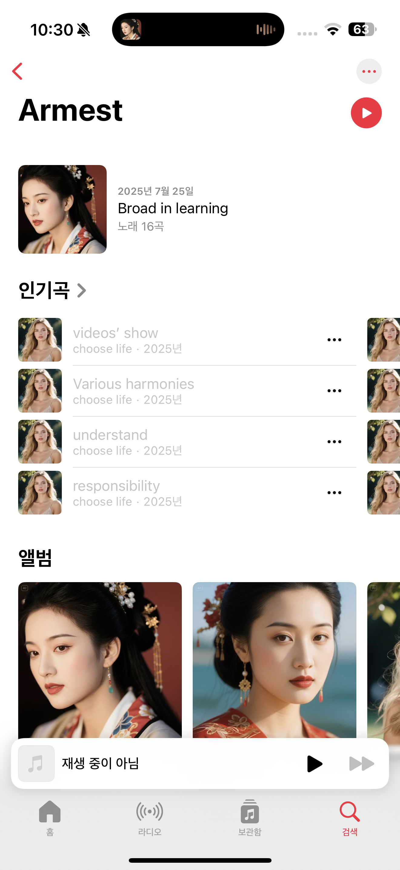 Apple Music의 ‘라디오’ 기능에 Armest를 등록해두면, 비슷한 장르의 아티스트들과 매치된 추천 곡들이 자동으로 흘러나와 새로운 음악적 영감을 얻을 수 있습니다. 또한, 가사 제공 기능을 활용해 직접 따라 불러보면서 더 깊이 몰입할 수 있다는 장점도 있습니다.