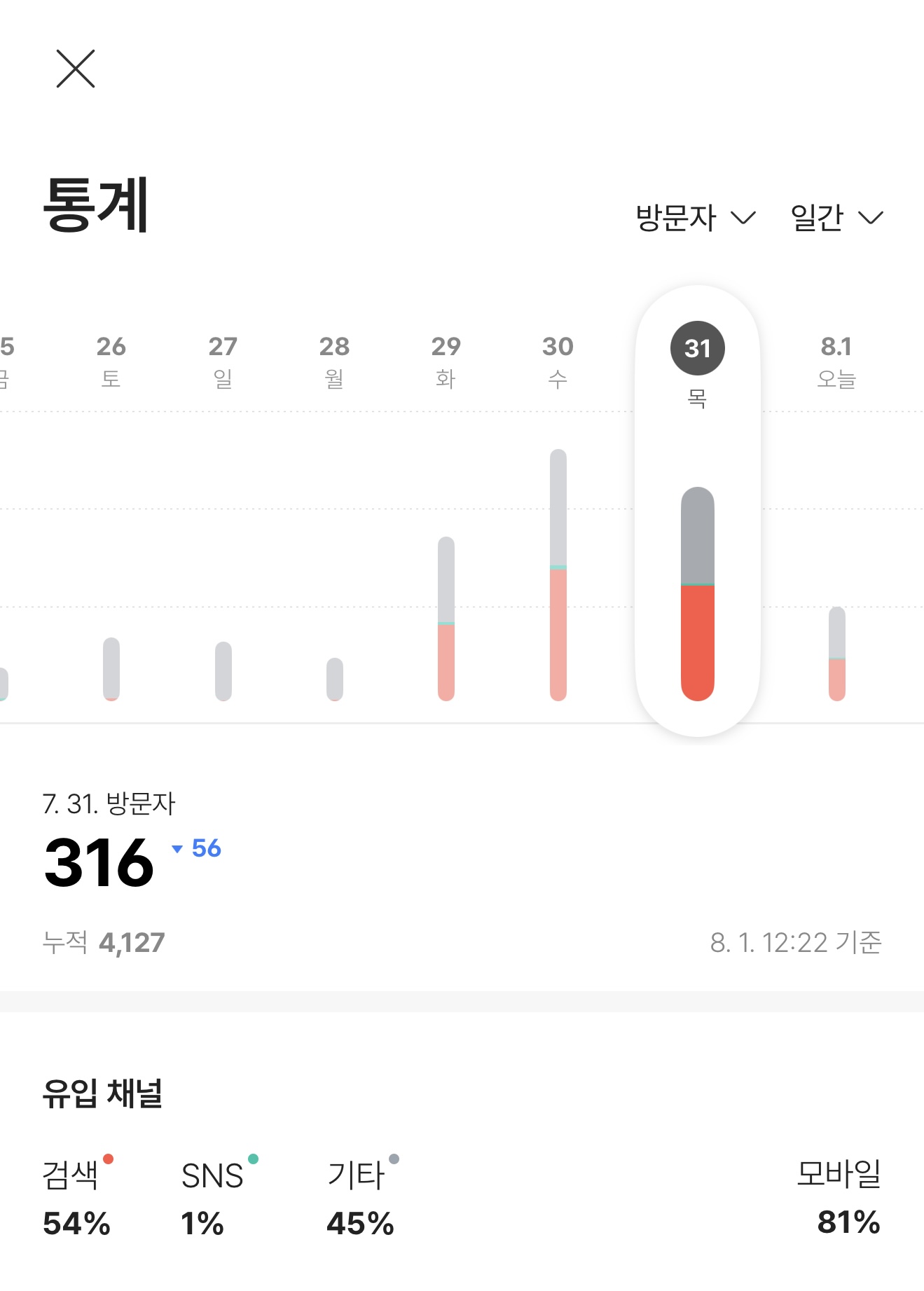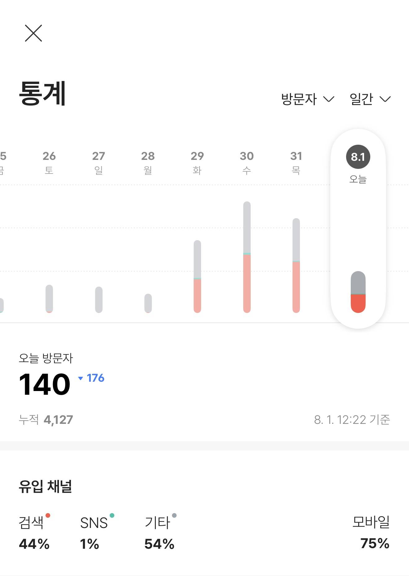 그리고 무엇보다 인상적이었던 건 모바일 비율입니다. 전체 방문자의 평균 70~81%가 모바일을 통해 방문했다는 점은, 앞으로의 글 구성이나 썸네일, 이미지 배치 등에 있어 모바일 최적화가 필수라는 사실을 다시금 느끼게 해줬습니다.