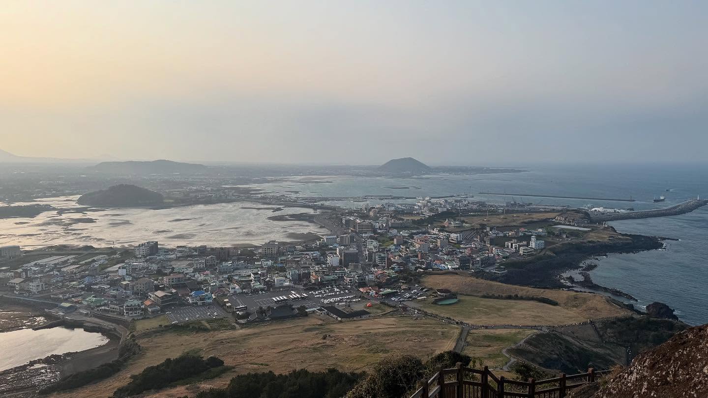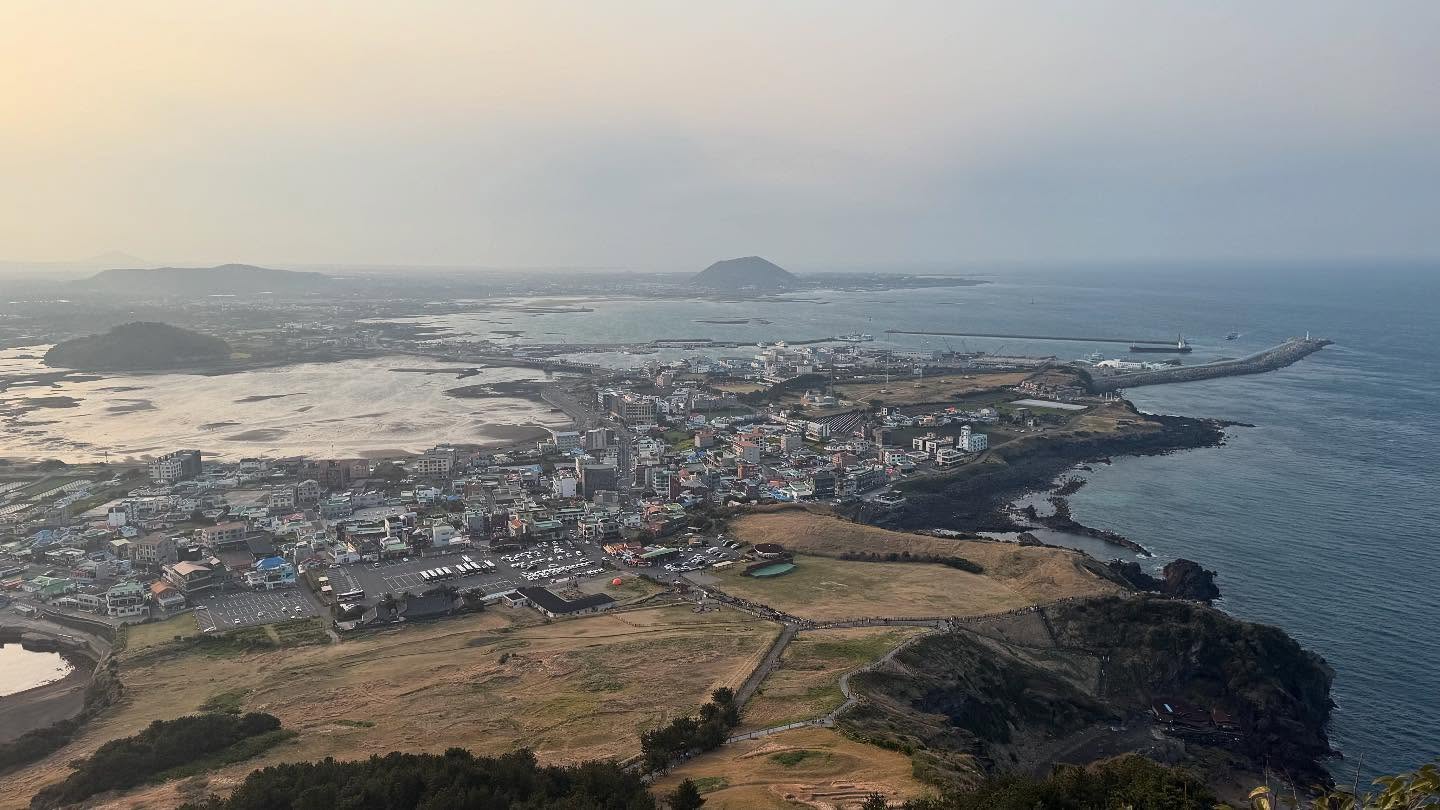 성산 일출봉의 정상에 오르면 360도 파노라마 뷰가 기다리고 있습니다. 남쪽으로는 푸른 바다와 우도가 보이고, 북쪽으로는 제주의 들판과 마을 풍경이 펼쳐집니다. 특히 봄에는 유채꽃밭이 형형색색으로 물들어 황금빛 물결을 이루는데, 이 모습은 사진작가들이 사랑하는 장면 중 하나입니다. 바람이 불 때마다 꽃들이 일렁이는 모습과 멀리 보이는 일출봉의 자태는 제주만의 낭만을 고스란히 담고 있습니다.