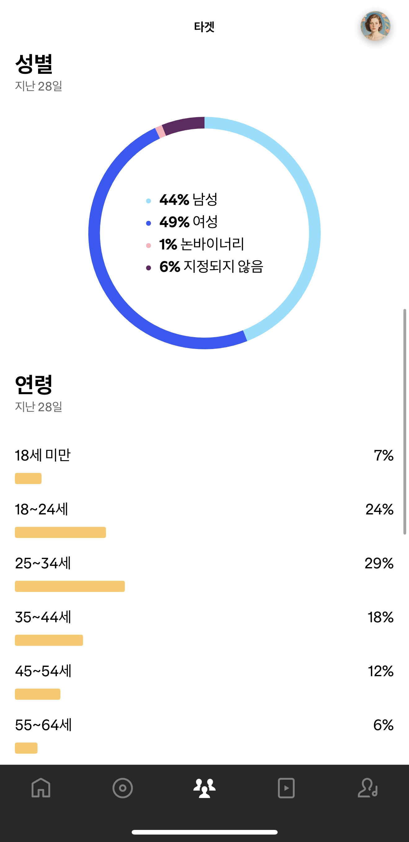 • 45세 이상 리스너도 약 18%를 차지하여, 세대별로 고르게 음악을 즐기고 있음을 보여줍니다.