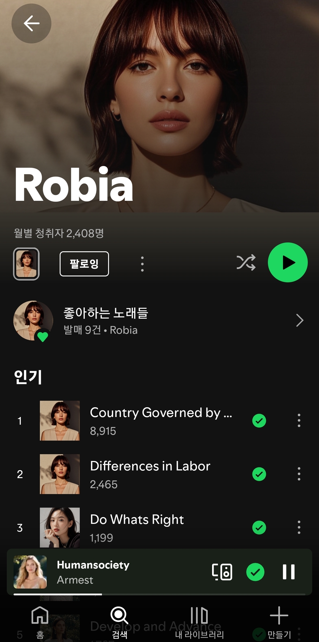 마지막으로 소개할 아티스트는 Robia. 그녀의 첫인상은 세련됨과 강렬함이다. 짧은 머리, 단정한 조명, 그리고 자신감이 느껴지는 눈빛. 그녀의 음악은 그런 이미지와 닮아 있다. 대표곡 ‘Country Governed by…’, ‘Differences in Labor’, ‘Do What’s Right’ — 제목만 들어도 사회 구조와 인간의 역할에 대한 비판적 시각이 느껴진다.